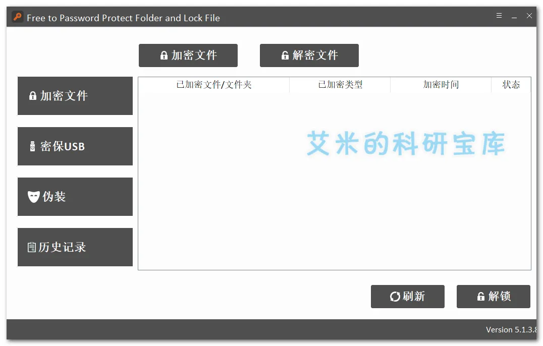 安装好后我们看到的界面如下图,上方有两个条目,分别是加密文件和解密文件,左侧四个条目主要是标签的作用,比如我们加密文件后,点击左侧加密文件就会显示所加密的目录,再点击保密USB,显示的就是保密的USB,是这个意思,右下方有刷新和解锁,刷新是刷新目录的,解锁是点击选择目录中的条目后解锁的。就没有再多余的东西了。