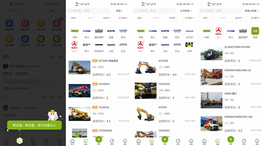 有市面上主流、最新款的工程设备信息,展示设备的参数、图片、详细介绍等数据。设备点评,是设备模块的最大亮点,机械之家经过数年的用户运营沉淀,拥有行业内最大的垂直用户粉丝群体,通过这些发表的设备点评,能真实、有效地反馈一款设备的各方面特点、优缺点,为他人提供快速了解设备的途径,也为使用者创造了交流设备的场所。