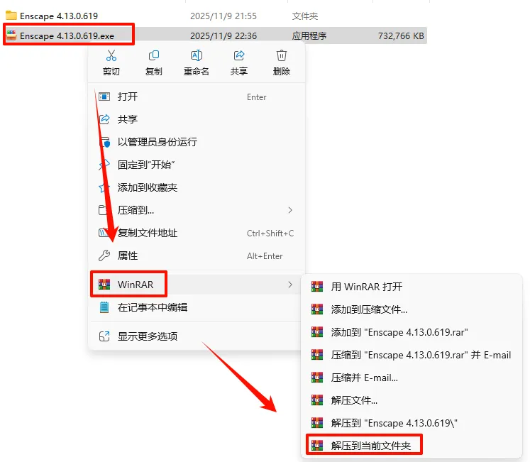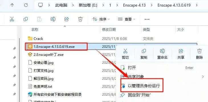 2.打开刚刚解压的文件夹,选中“1.Enscape-4.13.0.619.exe”文件,鼠标右键选择“以管理员身份运行”