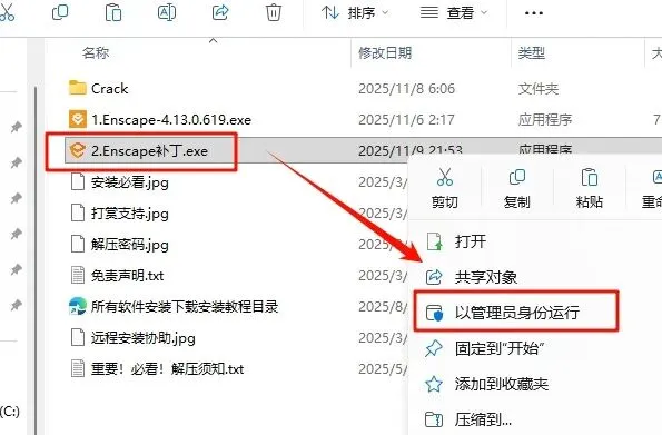 8.返回之前解压的“Enscape 4.13.0.619”文件夹,选中“2.Enscape补丁.exe”文件,鼠标右键选择“以管理员身份运行”