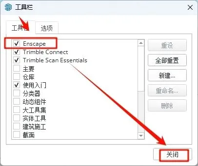14.勾选“Enscape”选项就会出现Enscape工具栏,点击“关闭”