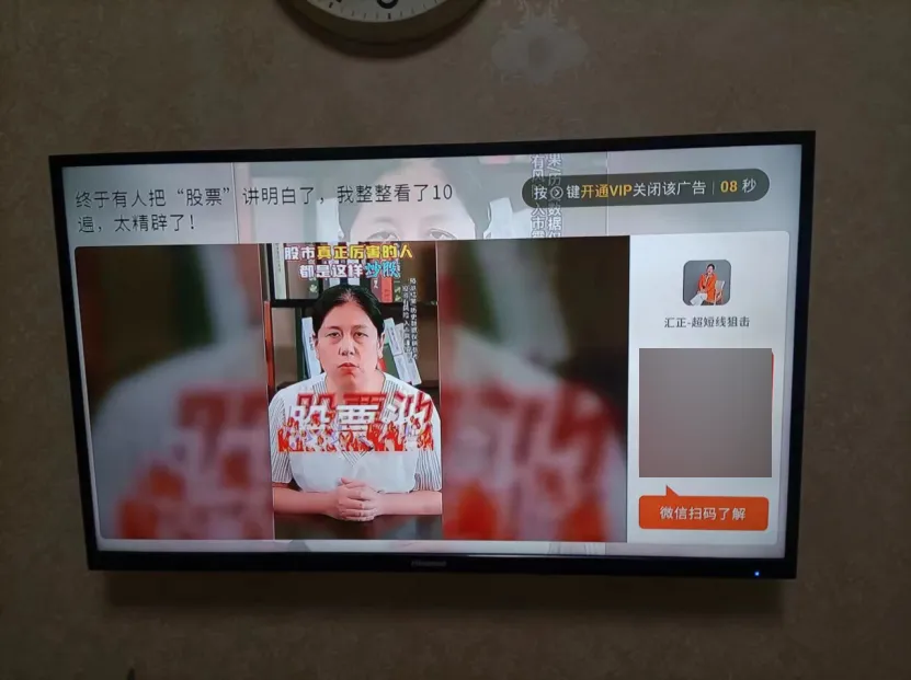 一类是视频app为非会员用户提供的片前广告,有教你投资理财炒股的,有原价5000多的派克峰冲锋衣卖你198的。这些都是典型的黑五类广告,目前依然在电视盒子里存在。