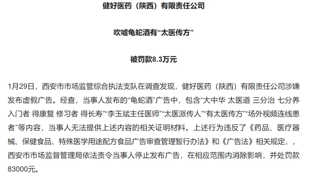 一时间神州大地突然冒出了各种稀奇古怪的中医老偏方:“雄凤山”雄氏老方风湿骨康片;“霍一手”灵耳贴;“刘一手”藏红花大膏药;“刘一毛”长白山欣古捷胶囊;“海一毛”明目贴;“丁三怪”拔喘膏;“郑三毛”前列贴;“周恩起”御生堂壮腰老方;“刘洪斌”:唐通5.0,其中号称“太医传方”的龟蛇酒更是被西安市市场监管综合执法支队罚款8.3万元。