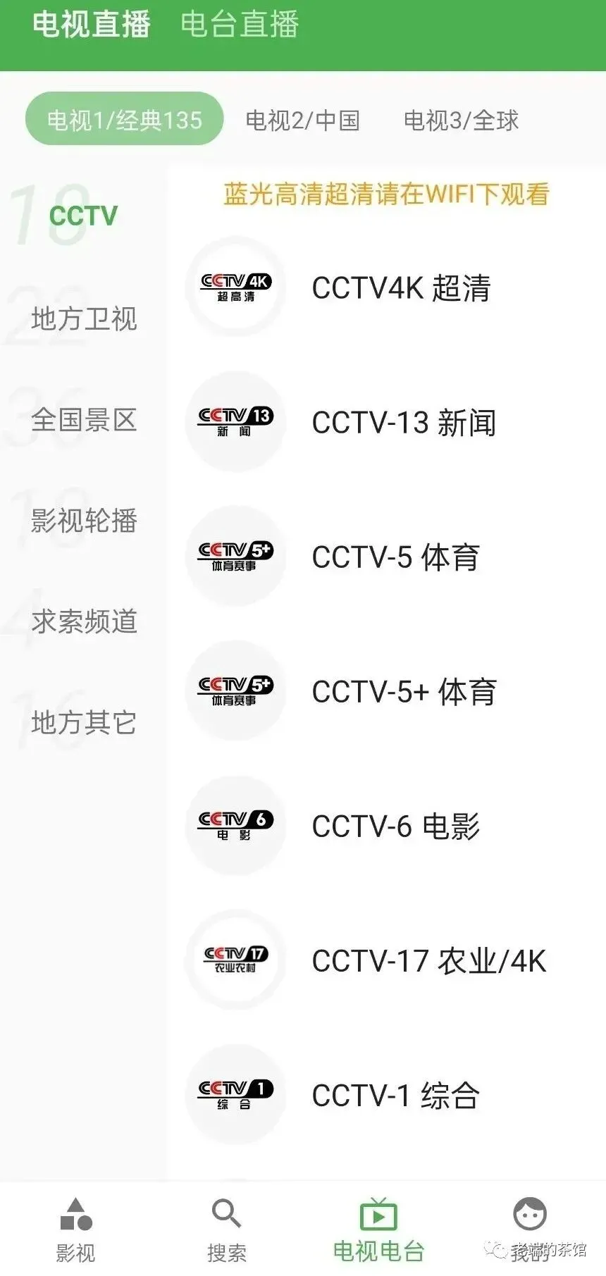 电视电台频道的栏目也是非常齐全的,像CCTV系列、地方卫视、全国景区、影视轮播、求索频道、地方其他等,同时还有更多像全球的频道也支持,画质也很给力!