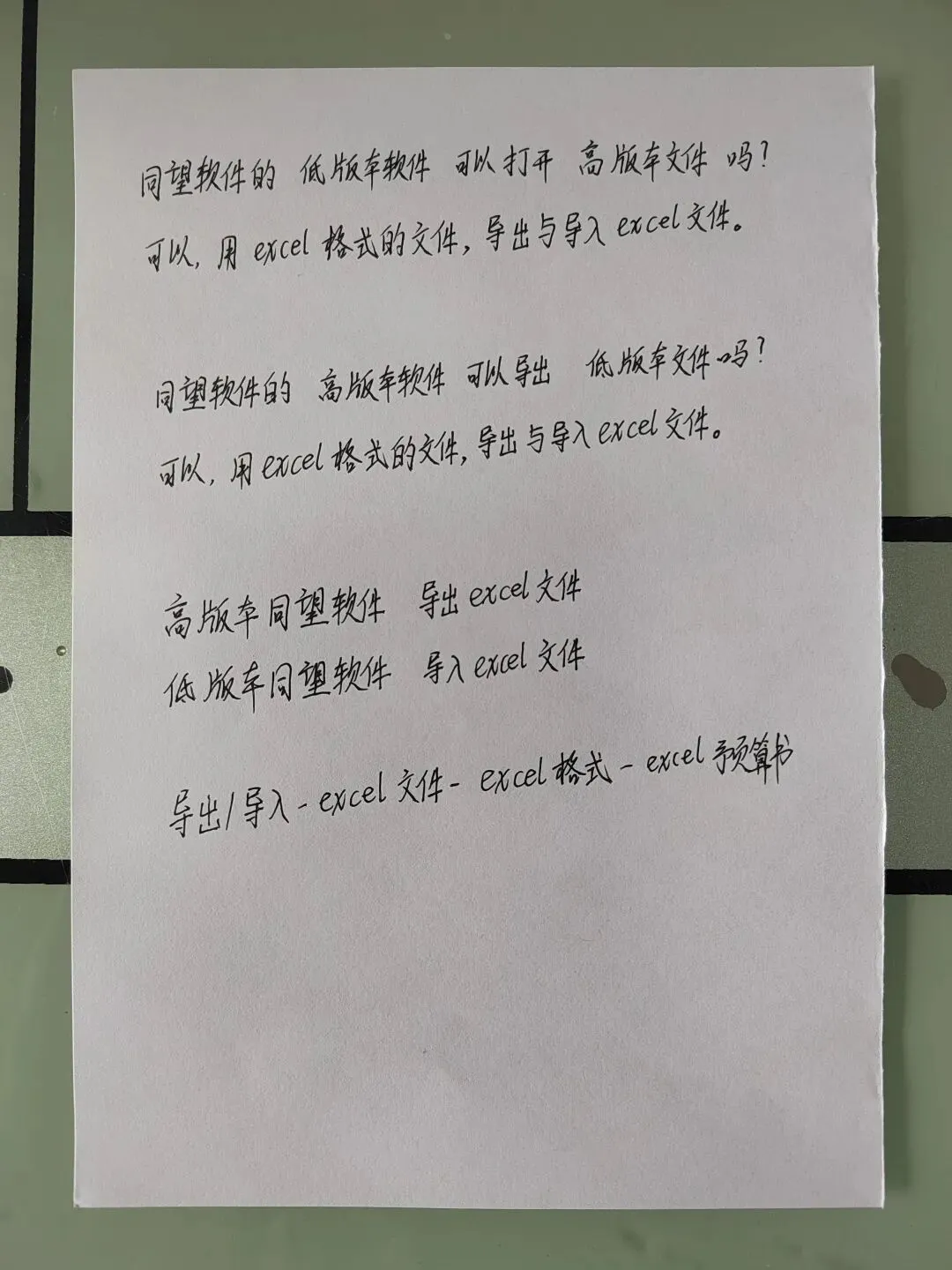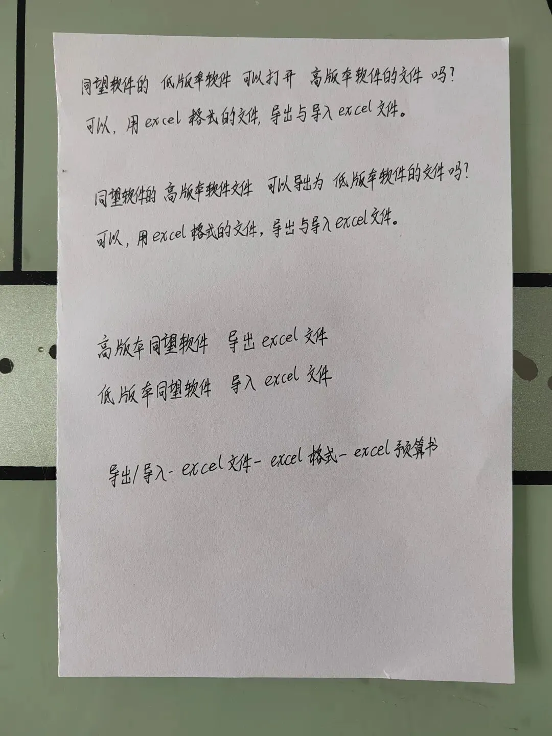 同望软件的 低版本软件 可以打开 高版本文件 吗?可以,用excel格式的文件,导出与导入excel文件。同望软件的 高版本软件 可以导出 低版本文件 吗?可以,用excel格式的文件,导出与导入excel文件。高版本同望软件导出excel文件,低版本同望软件导入excel文件。导出/导入-excel文件-excel格式-excel预算书。低版本软件 打开 高版本文件,高版本软件 导出 低版本文件。软件的版本高低,文件的版本高低。the edition/version of the software,the edition/version of the file.不同人使用的软件的版本高低可能有差异,保存成低版本的文件可以更方便他人打开文件,方便文件的交流,方便工作中的合作,低版本文件的打开通用性更强,低版本软件的打开友好性更好。不同人升级软件版本的时间可能有差异。不同人升级软件版本的及时性可能有差异。不同人升级软件版本的时间的影响因素很多:年度经费预算(包括由于资金的临时紧张性而适当推迟软件的升级等)、升级软件的成本(包括优惠力度的洽谈、赠送的礼品情况、升级方案的选择等)、新项目的情况(包括新项目招投标对电子报价文件的要求变化等)、项目的地区情况(包括地区的政策等)、同行升级软件的比例与速度(包括从众心理的作用等)、对新版本软件的认识(包括软件公司对新版本软件的宣传力度与效果等、软件新版本功能、新版本界面的必要性与实用性等)、人的性格(包括特别追随新版本,一旦有新版本就第一时间立即更新等)等。更新/升级软件版本。update/upgrade the edition/version of the software.我需要更新到新版本。I need to update/upgrade the software to the new version.软件的最新版本。the latest version of the software.新版本。new version.老版本。old version.