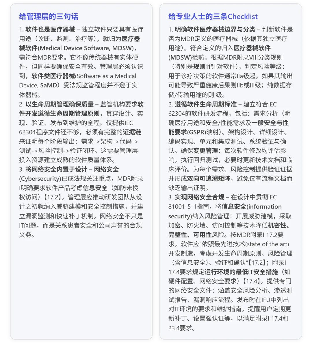 综上,软件医疗器械的合规焦点可以概括为:严谨的软件工程过程 + 全面的安全防护 + 受控的算法更新。接下来我们将结合实践谈谈“怎么做”。