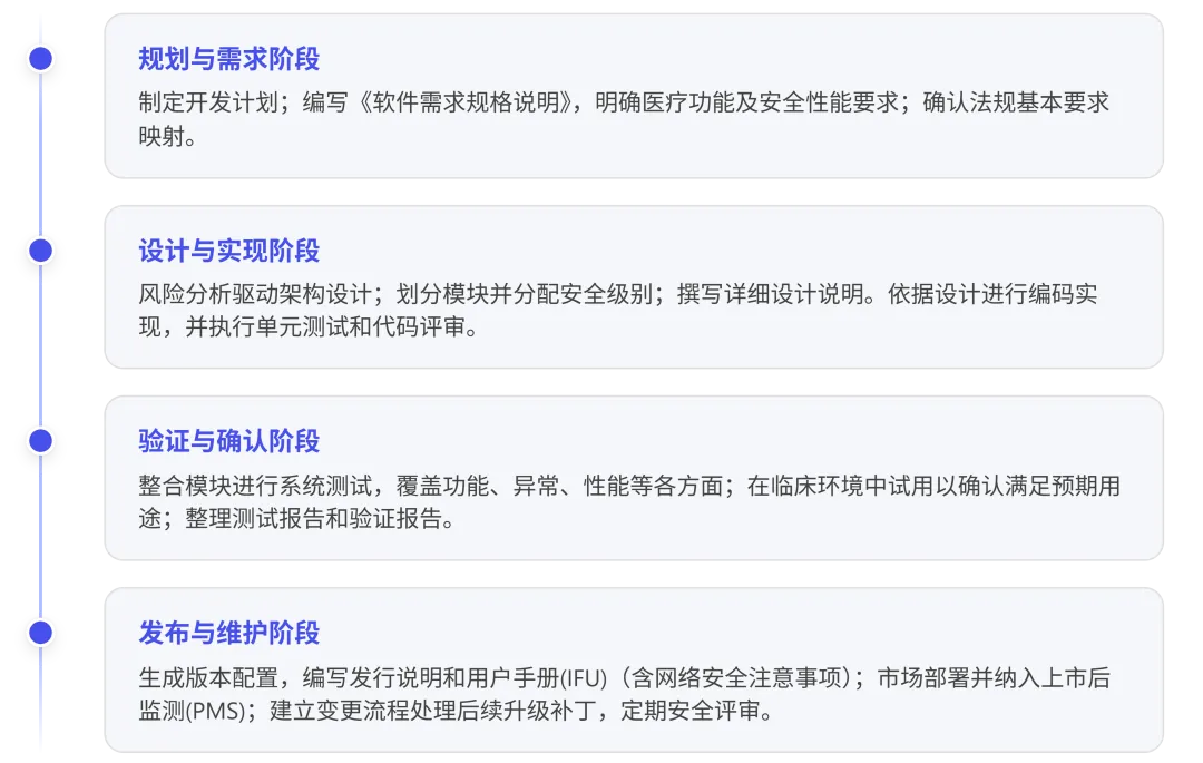 1. 软件生命周期:建立有据可查的开发流程\ 软件开发需遵循计划 -> 需求 -> 设计 -> 实现 -> 测试 -> 发布 -> 维护的生命周期模型,并确保每一步都有相应的文档输出和评审记录。这正是IEC 62304《医疗器械软件—软件生命周期过程》标准的要求。具体实践中: