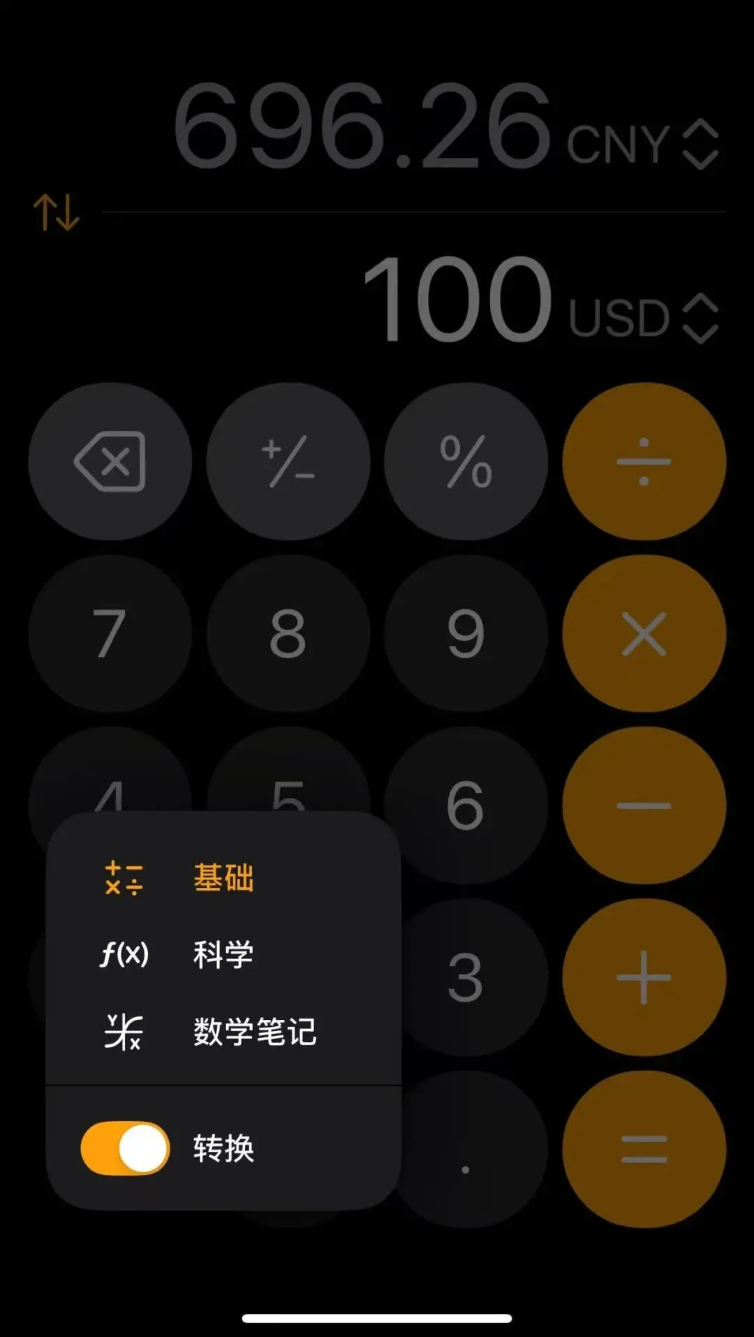 计算器:点击右下角之转换,联网时可以了解世界各国货币兑换价格。