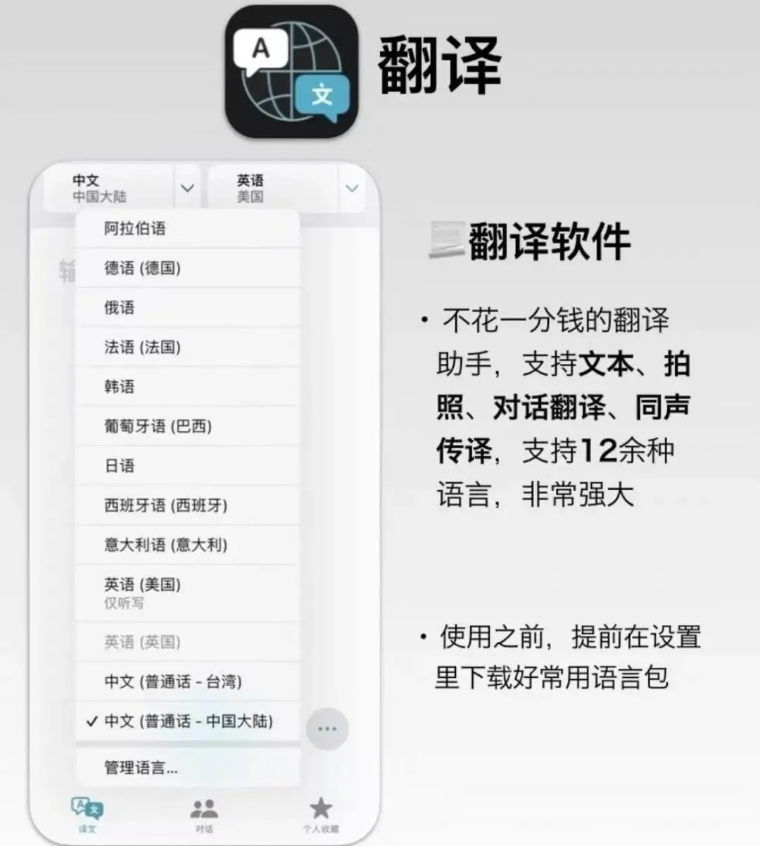 地图:提供导航和地点查询。建议与高德地图一起使用;出国后建议与谷歌地图一并使用。