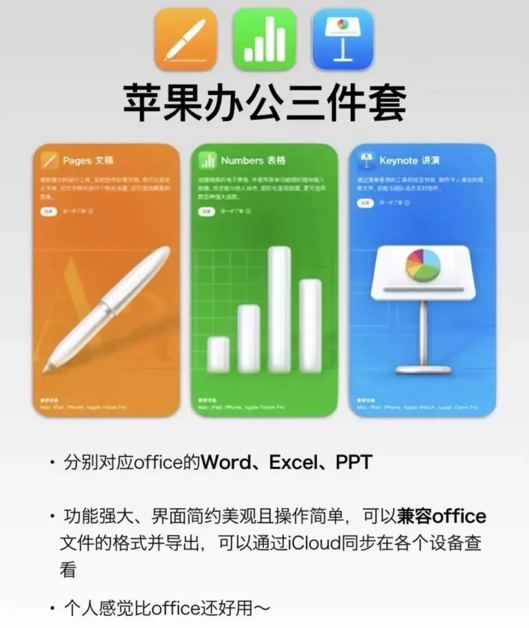 Pages/Numbers/Keynote:文档、表格、幻灯片处理套件。