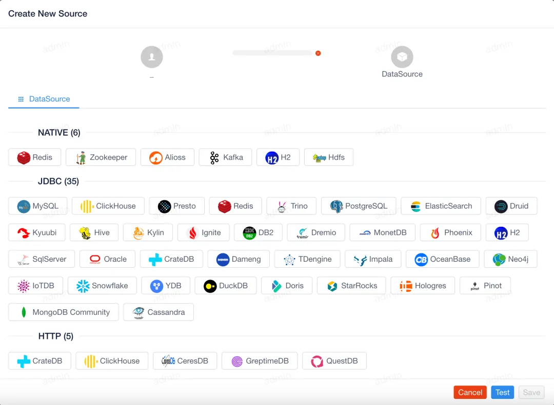 • 广泛的数据源支持:DataCap 支持超过 60+ 数据源,包括 ClickHouse、MySQL、PostgreSQL、MongoDB、Redis、Elasticsearch、Kafka 等主流数据库和中间件。