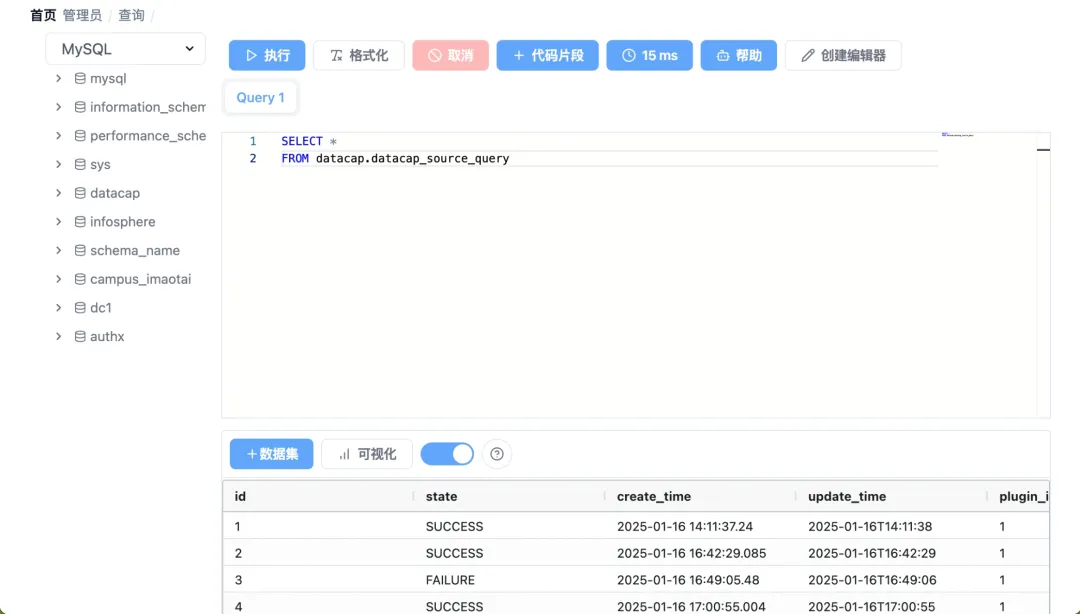 • 统一的查询语言:DataCap 将所有数据源的查询语言统一为 SQL,无论是关系型数据库、NoSQL、文件系统还是其他中间件,都可以使用 SQL 进行操作。