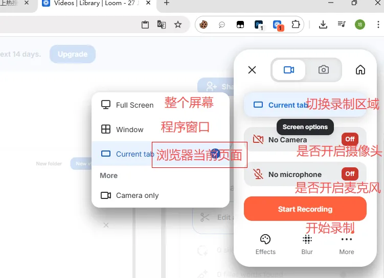 loom支持录制chrome之外的其他应用程序, 也对计算机进行全屏录制