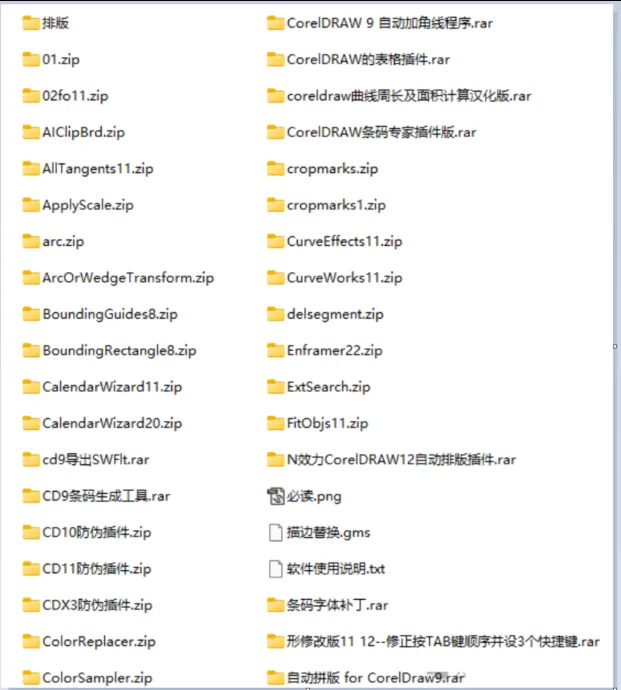 注意:有些不是最新版本的,可能对新版的CorelDRAW会不兼容,但并不是所有人都用最新版CDR,并且36款插件都是单独的,需要哪款就安装哪款,相互不干扰!
