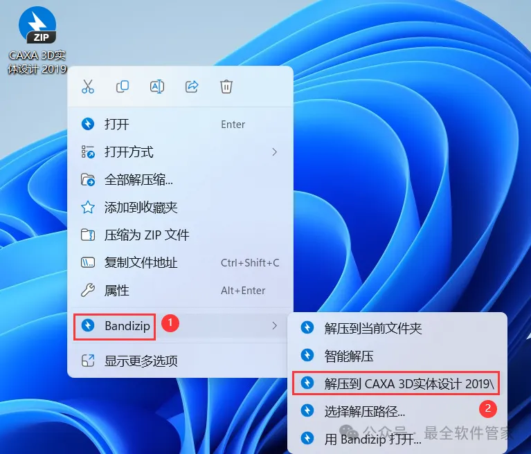 1、下载CAXA 3D实体设计 2019软件安装包到电脑上,右键选择【解压到CAXA 3D实体设计 2019\】