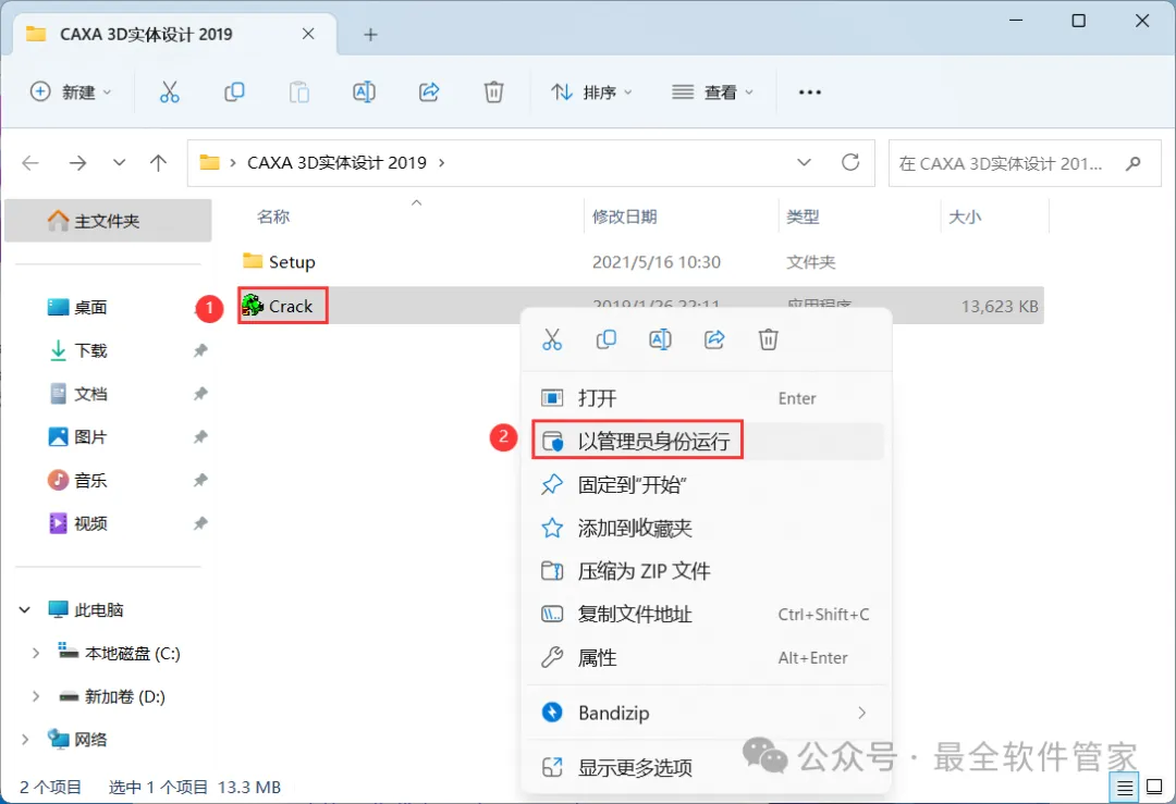 10、回到CAXA 3D实体设计 2019文件夹,找到【Crack】程序,右键选择【以管理员身份运行】它