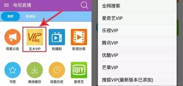 打开软件,里面看到一个 “五大 VIP ”的图标。点击它有爱奇艺、乐视、优酷等六大平台的 VIP 视频资源。