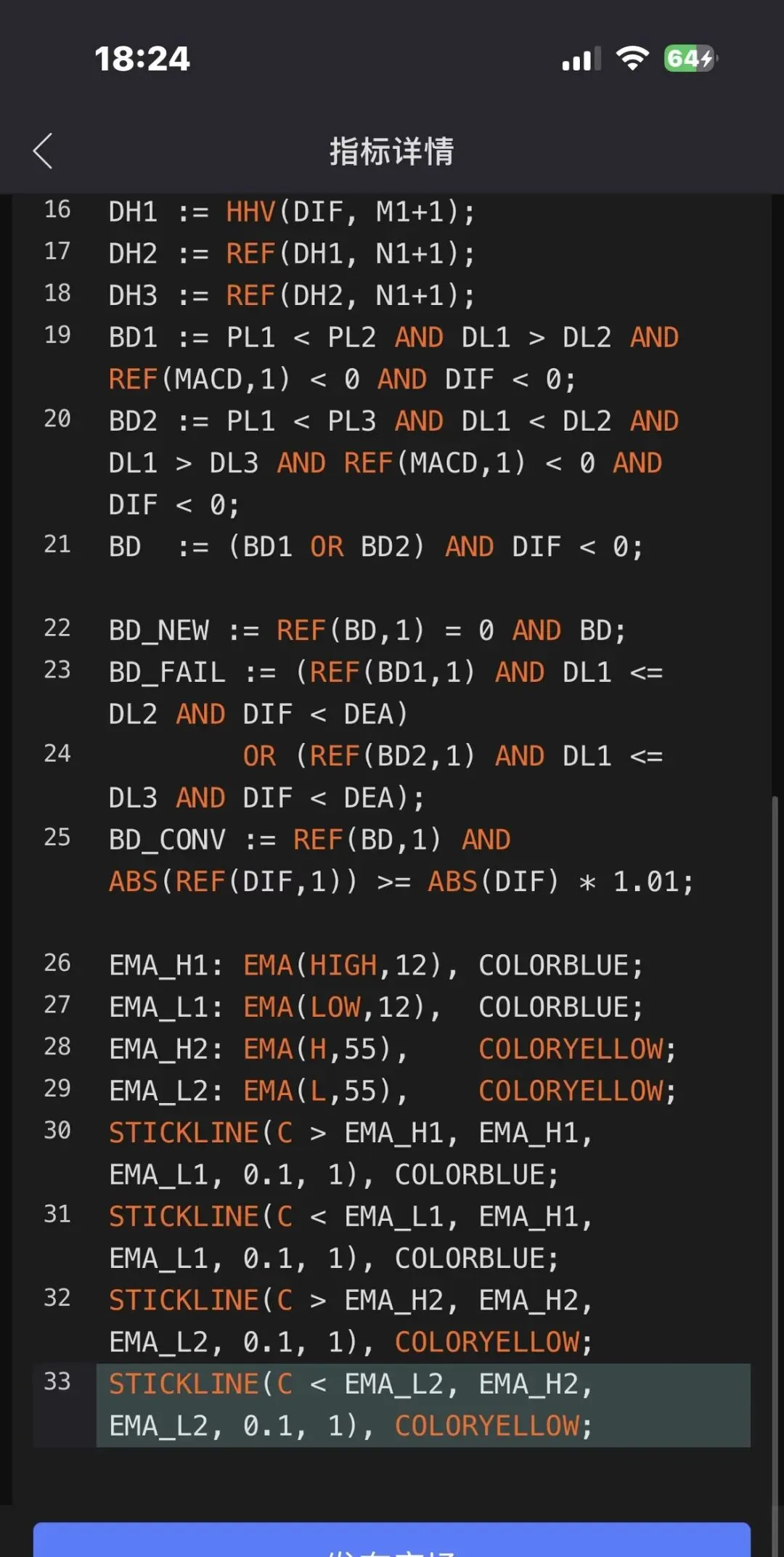 STICKLINE(C < EMA_L1, EMA_H1, EMA_L1, 0.1, 1), COLORBLUE;