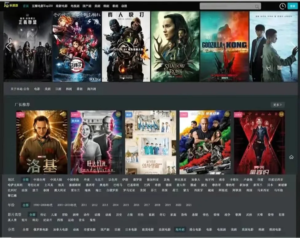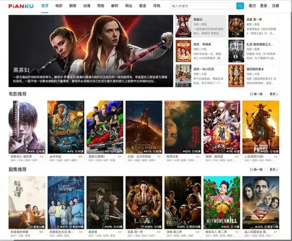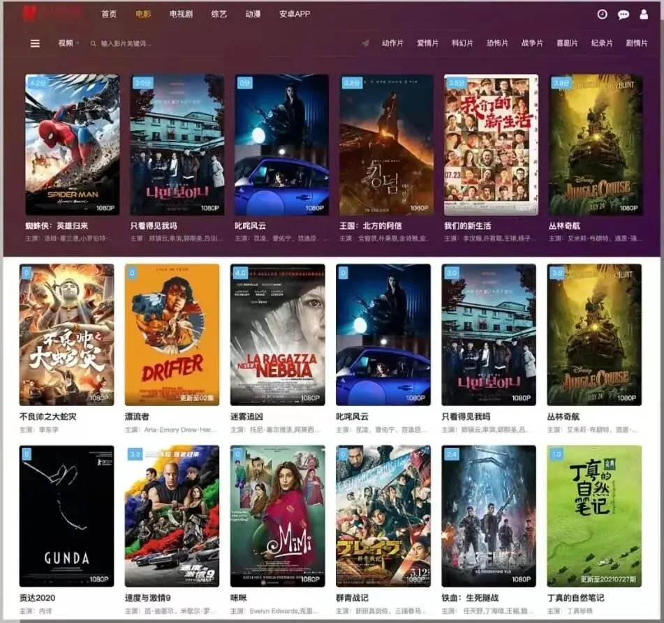 页面简洁大气,没有广告,可以拖动进度条,支持搜索和筛选电影,影片更新很快。