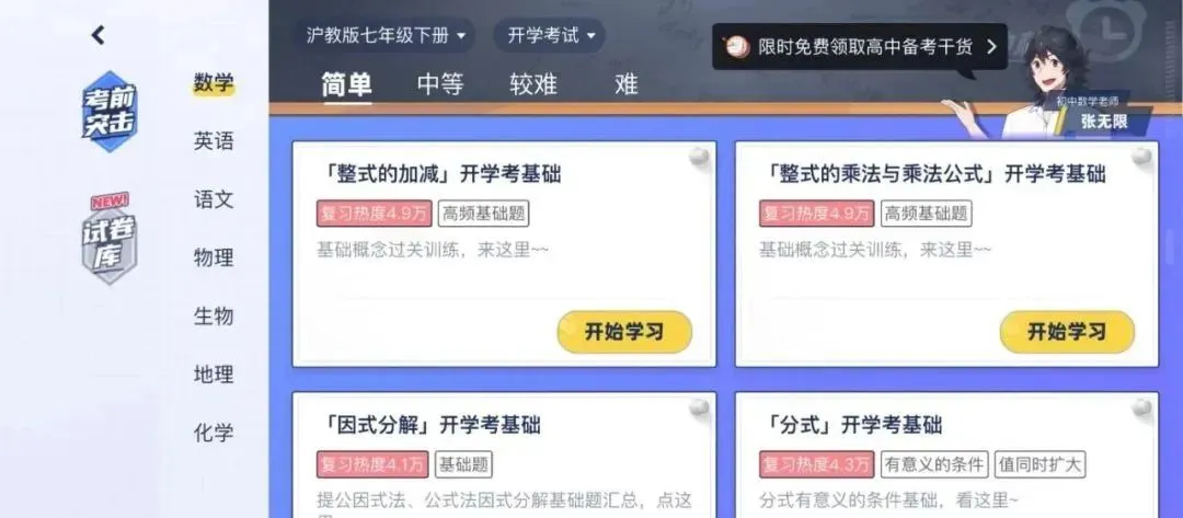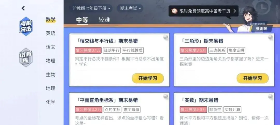 考前突击板块,包括了开学考试、首次月考、期中考试、第三次月考和期末考试。