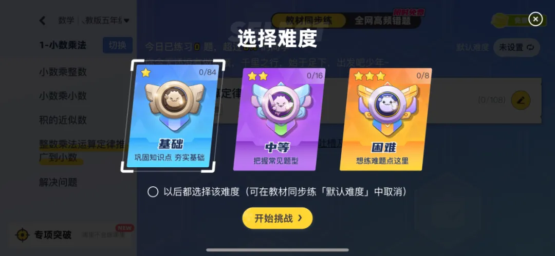 在这里可以选一下难度、基础中等、困难,用孩子的基础来选择,点进来就可以开始挑战,挑战是根据孩子的等级去给推送试题库的。