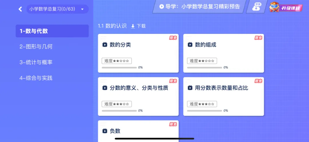 【总复习】:这部分是每一学习阶段(小学/初中/高中)的总结回顾,同样也是课程+习题的模式。