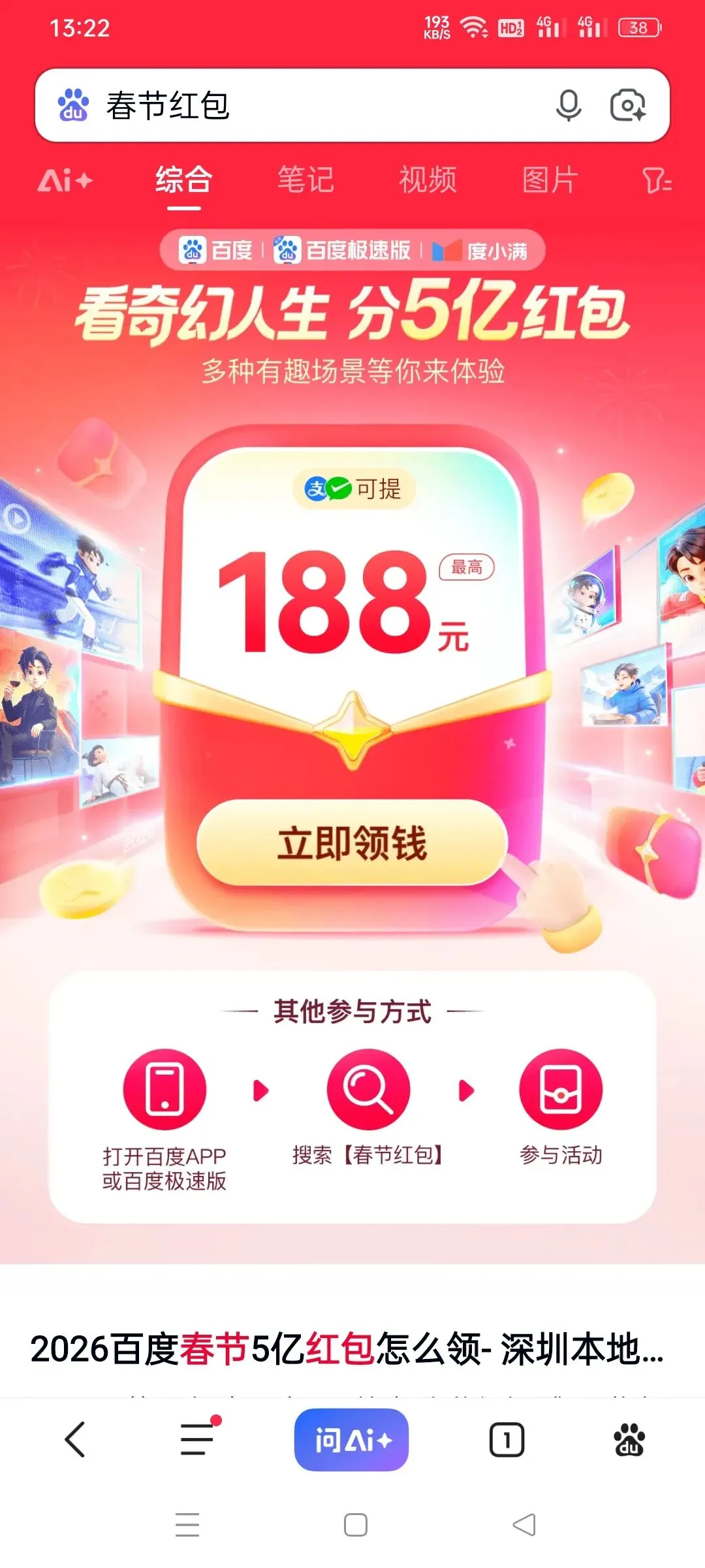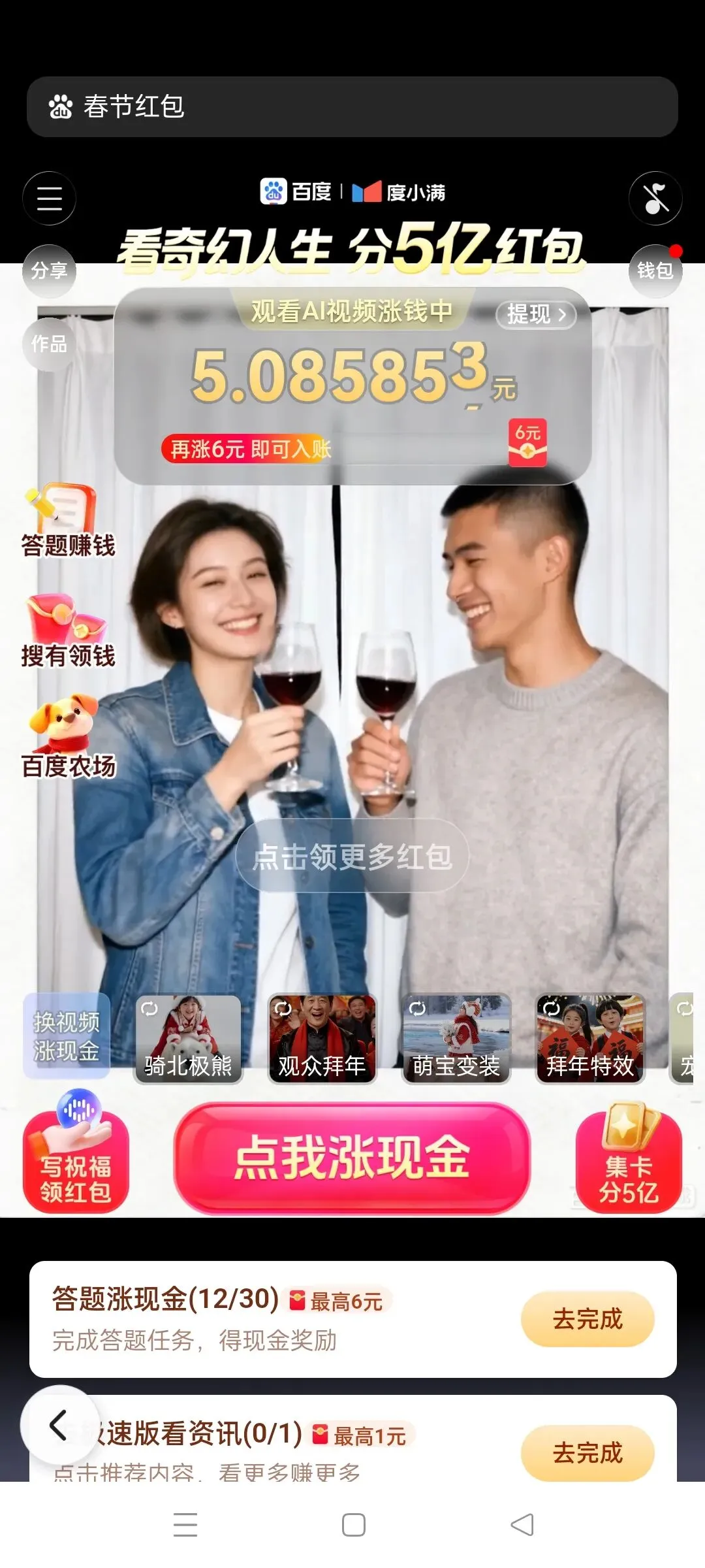 百度:下载百度然后进去搜春节红包,进去以后可以做任务领红包,然后提现,提现是可以提,预计到过年应该能有30左右的红包吧,然后也能集卡,但百度集卡我是一个没集到,红包可以领,卡是一张没有