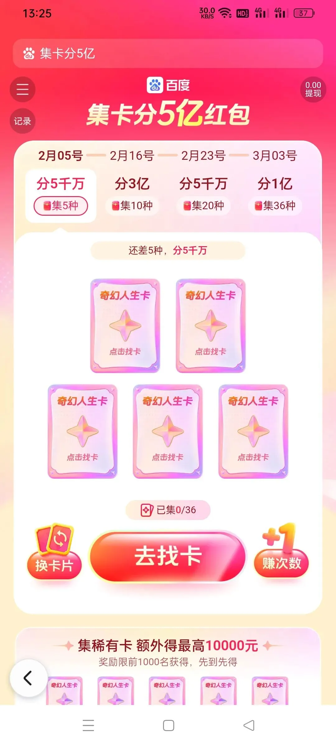 我从昨天到现在做的全部任务,但一张卡没抽到,不知道其他人啥样,个人感觉它不想给我分,系统也不是很稳定,应该是集卡的人多,后台运行不正常,然后里面还有一些其他领红包活动,可以自行查看