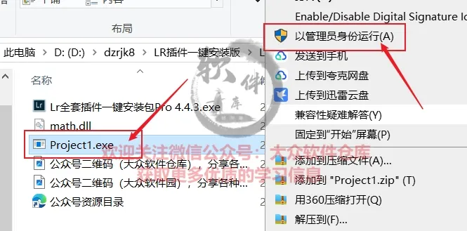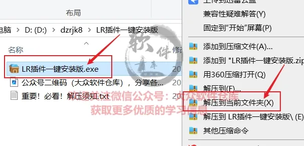 1.把资源从网盘下载到电脑上面,右键LR插件一键安装版.exe压缩包选择解压到当前文件夹。