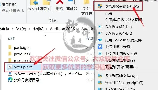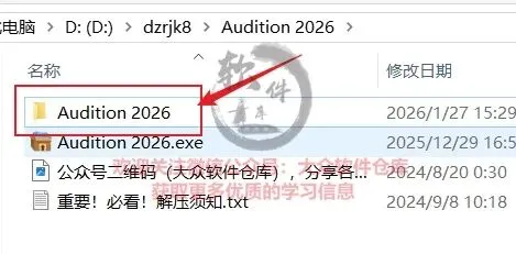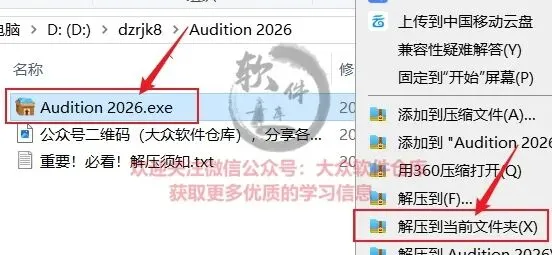 1.把资源从网盘下载到电脑上面,然后右键Audition 2026.exe压缩包选择解压到当前文件夹;