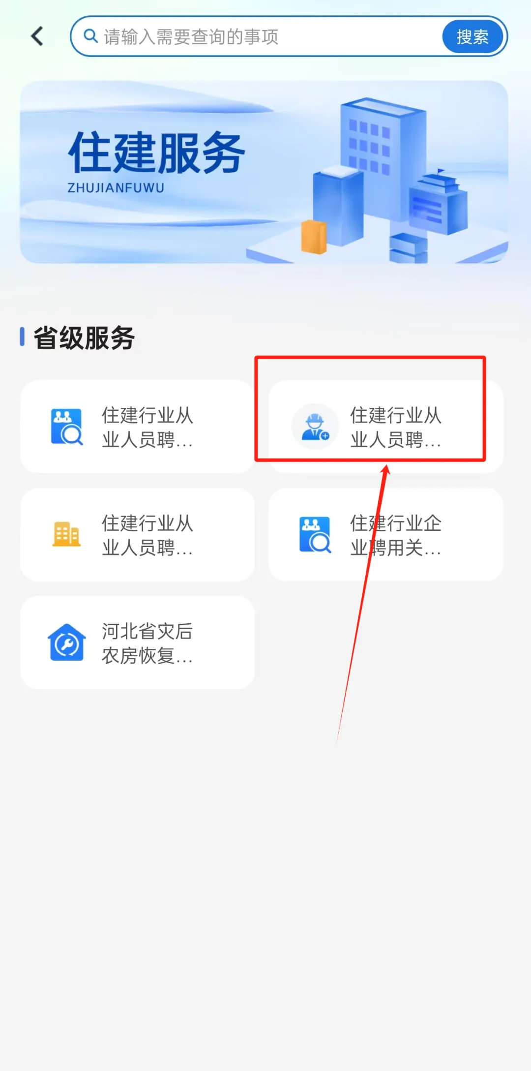 第一步:从业人员登录“冀时办APP”个人账号→点击进入“冀时办”APP首页→选择“河北省”→点击“住建”按钮,进入省级服务页面。