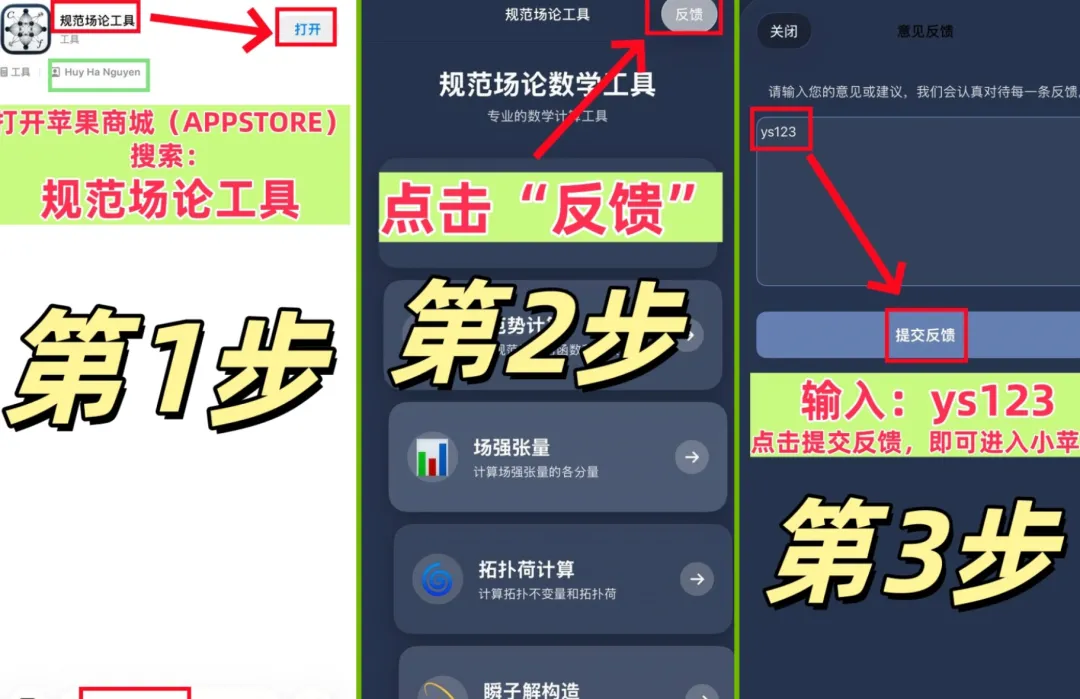 在【问题反馈】中输入“ys123”并提交反馈,显示“提交成功”即可进入小苹果。