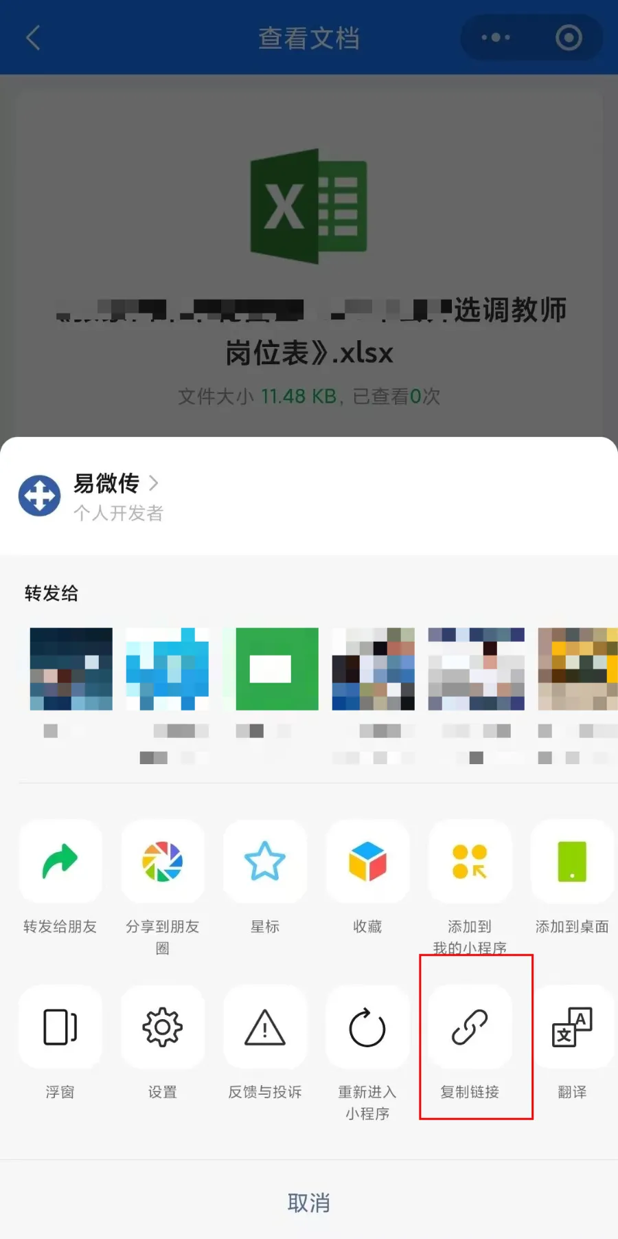 点击上面蓝色区域内,查看文档右面的三个小点。然后在下面弹出的页面里点击复制链接。