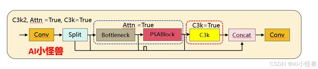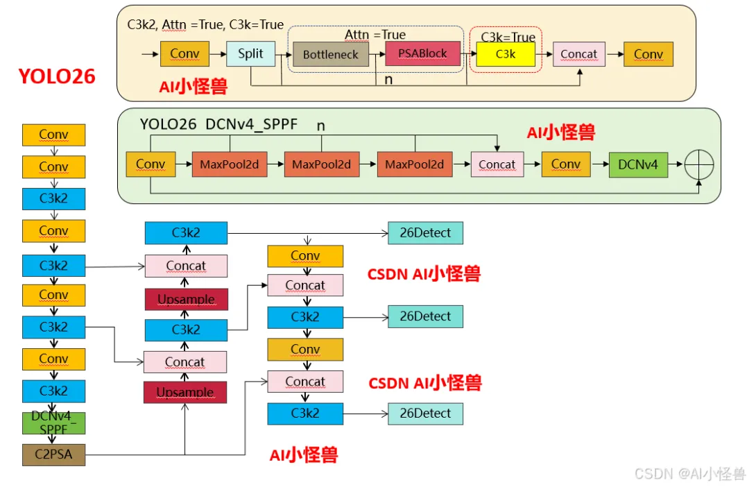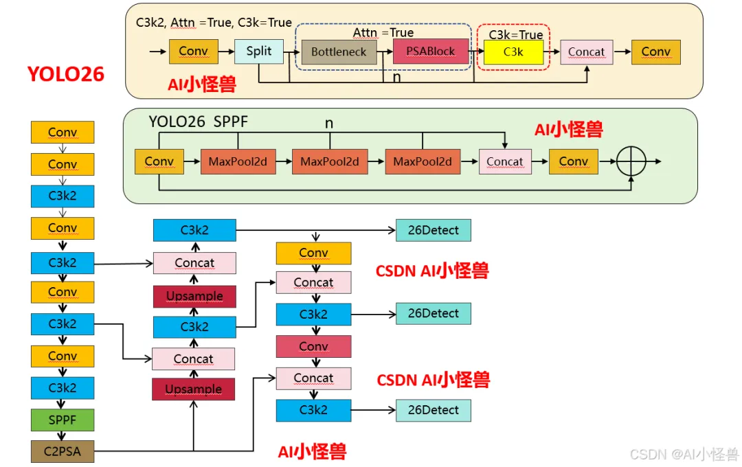 1)注意力机制的新增:YOLO26 的 C3k2 首次引入PSABlock(金字塔注意力模块),通过attn参数控制是否启用,这是两者最核心的功能差异 —— 启用后模块会先通过 Bottleneck 提取基础特征,再通过 PSABlock 增强关键区域的特征权重,提升小目标 / 复杂场景的检测效果。