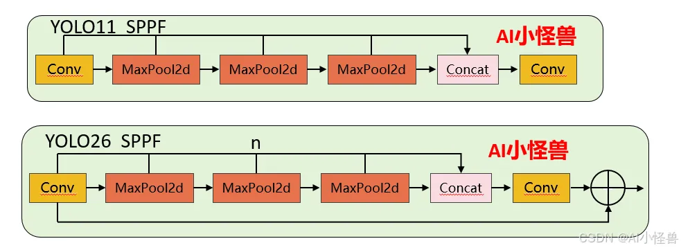 1)池化次数灵活性:YOLO11 的 3 次池化是硬编码的,要修改必须改源码;YOLO26 通过n参数可灵活调整(比如设为 2 次或 4 次),无需改核心逻辑。