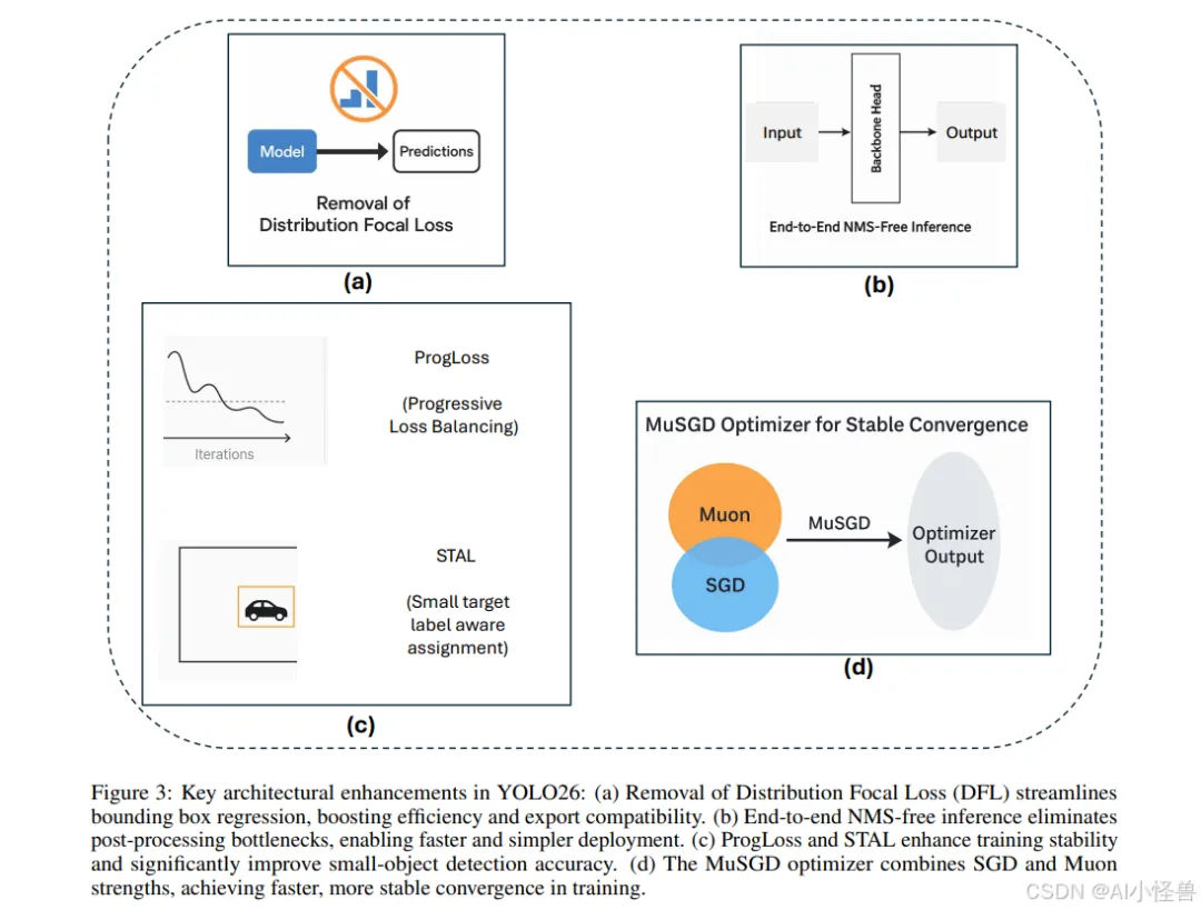 YOLO26引入了多项关键架构创新,使其区别于前几代YOLO模型。这些增强不仅提高了训练稳定性和推理效率,还从根本上重塑了实时边缘设备的部署流程。本节将详细描述YOLO26的四项主要贡献:(i)移除分布焦点损失(DFL),(ii)引入端到端无NMS推理,(iii)新颖的损失函数策略,包括渐进损失平衡(ProgLoss)和小目标感知标签分配(STAL),以及(iv)开发用于稳定高效收敛的MuSGD优化器。我们将详细讨论每一项架构增强,并通过对比分析突显其相对于YOLOv8、YOLOv11、YOLOv12和YOLOv13等早期YOLO版本的优势。