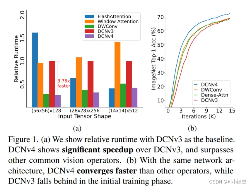 图1所示。(a)我们以DCNv3为基准显示相对运行时间。DCNv4比DCNv3有明显的加速,并且超过了其他常见的视觉算子。(b)在相同的网络架构下,DCNv4收敛速度快于其他视觉算子,而DCNv3在初始训练阶段落后于视觉算子。