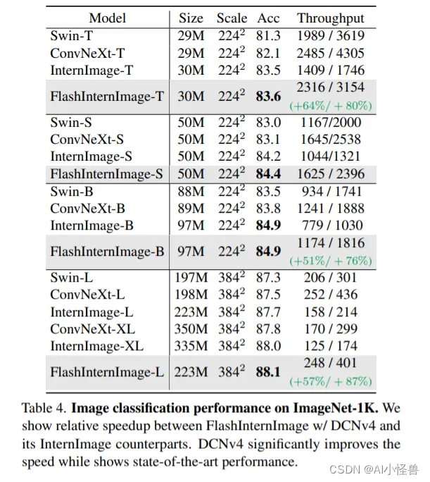 表4。ImageNet-1K上的图像分类性能。我们展示了FlashInternImage w/ DCNv4和它的InternImage对应版本之间的相对加速。DCNv4显着提高了速度,同时显示了最先进的性能。