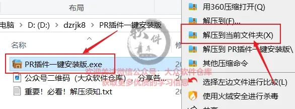 1.把资源从网盘下载到电脑上面,右键PR插件一键安装版.exe压缩包选择解压到当前文件夹。