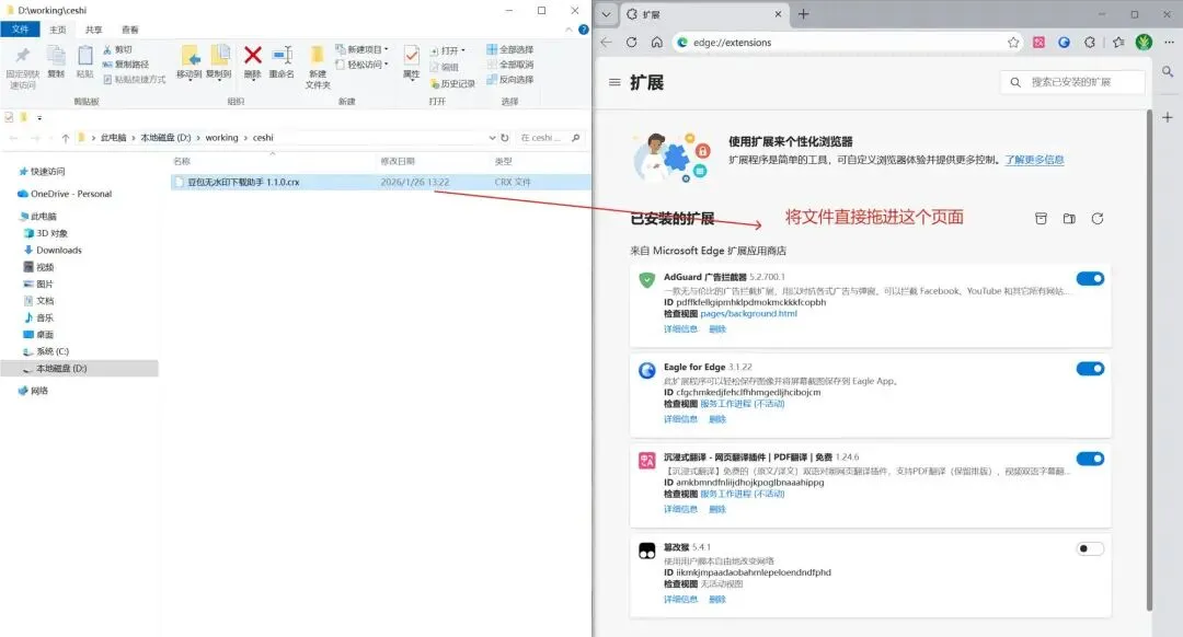 找到刚才下载的 .crx 安装包,拖动到扩展管理页面。详细图文教程