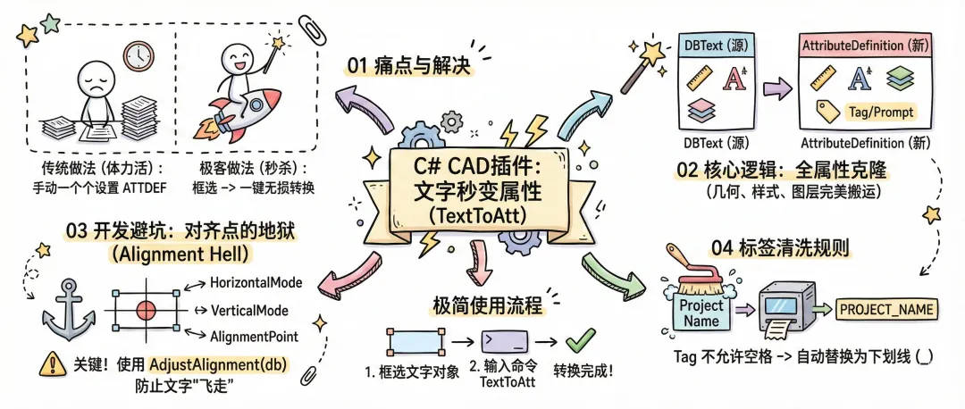 CAD 的属性标签 (Tag) 是不允许包含空格的。如果你的原文字是 “Project Name”,直接赋值给 Tag 会导致创建失败。代码中使用了 Replace(" ", "_") 将其自动转换为 “PROJECT_NAME”,这是一个非常实用的容错细节。