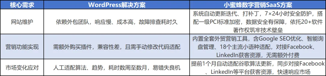 我们聚焦解决外贸企业真实痛点,而非制造技术焦虑,对比WordPress与小蜜蜂数字营销TradeBee SaaS的核心差异,优势一目了然: