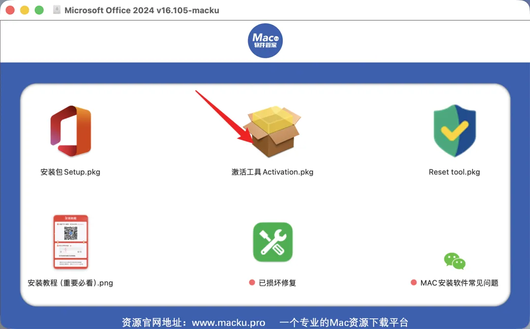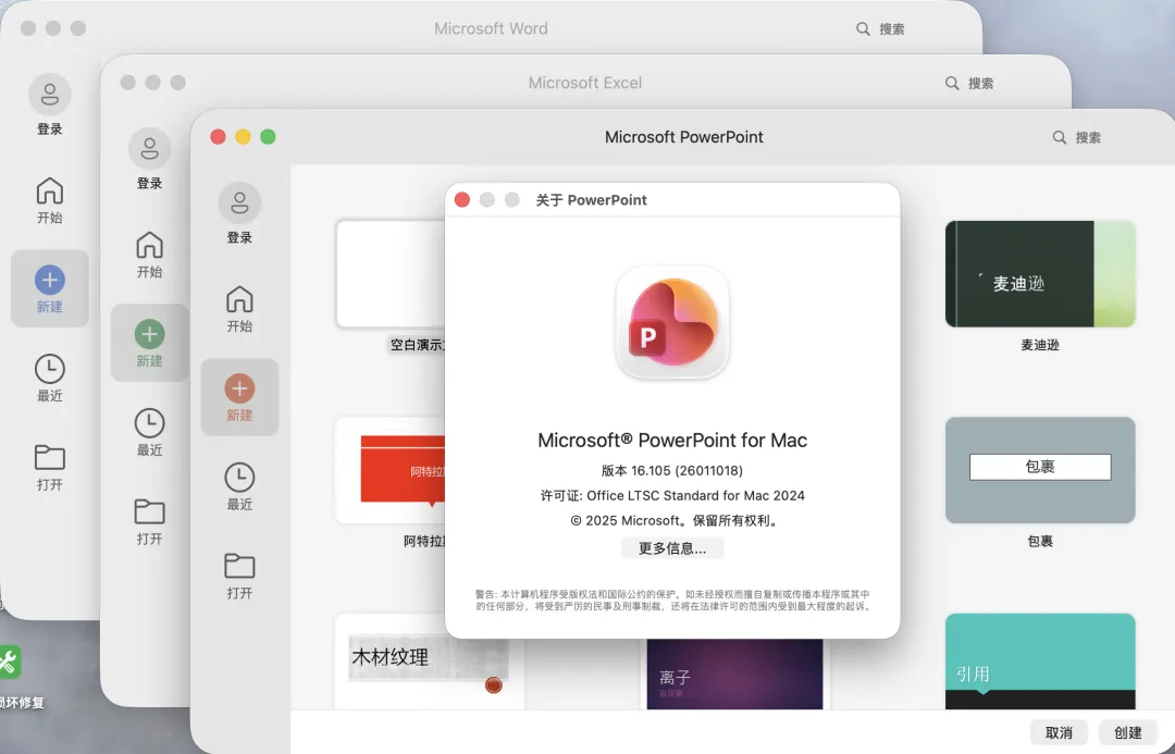 软件介绍Microsoft Office2024 包含了新版本的 Word、Excel、PowerPoint 以及现有的 OneNote 和 Outlook 等组件组成,完美支持 OS X El Capitan、Yosemite 以及 Retina 高分辨率视网膜屏幕。支持包含简体中文在内的多国语言、支持全屏模式、支持沙箱、集成 OneDrive 云存储、支持在线协同编辑功能。Office的各个应用程序都有各自独特的功能和特点。例如,Word是一个文本编辑器,用户可以用它来创建和编辑各种文档,包括文字、图像、表格等;Excel是一个电子表格应用程序,用户可以用它来处理和分析数据,制作各种图表和报表;PowerPoint则是一个演示文稿工具,用户可以用它来创建和分享演示文稿,用于会议、演讲等场合。除了这些常用的应用程序外,Office还包括其他一些组件,如Outlook、Access等。Outlook是一个电子邮件客户端和管理器,用户可以用它来管理电子邮件、日历、联系人和其他个人信息;Access则是一个数据库管理工具,用户可以用它来创建和管理数据库。Office还提供了许多高级功能和特性,如云存储、在线协作、智能数据分析等。通过这些功能,用户可以更加高效地完成各种办公任务,提高工作效率和决策能力。常见问题1.Mac安装软件常见问题集合(腾讯文档):https://docs.qq.com/doc/DUFRLTWFlQnlWcW9p