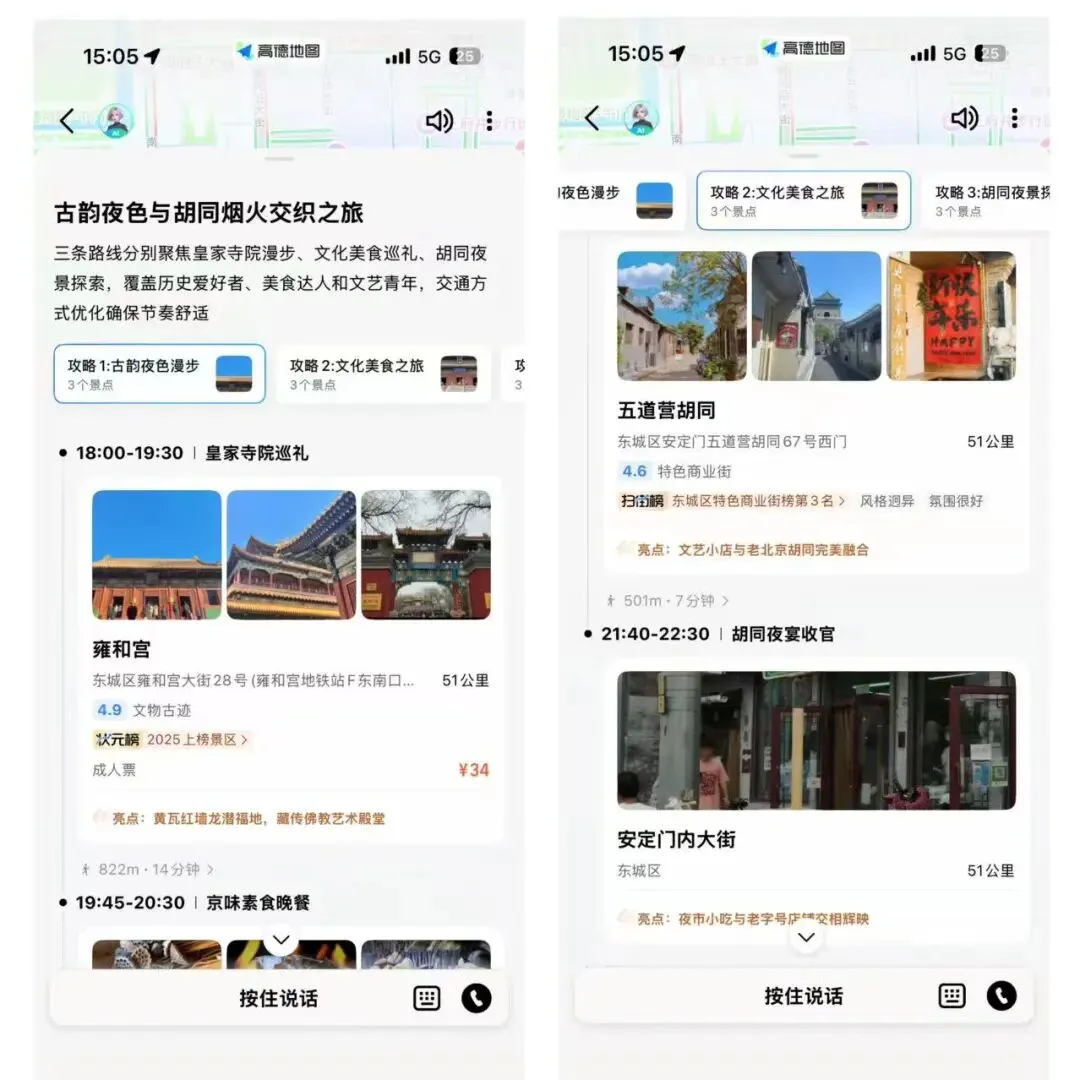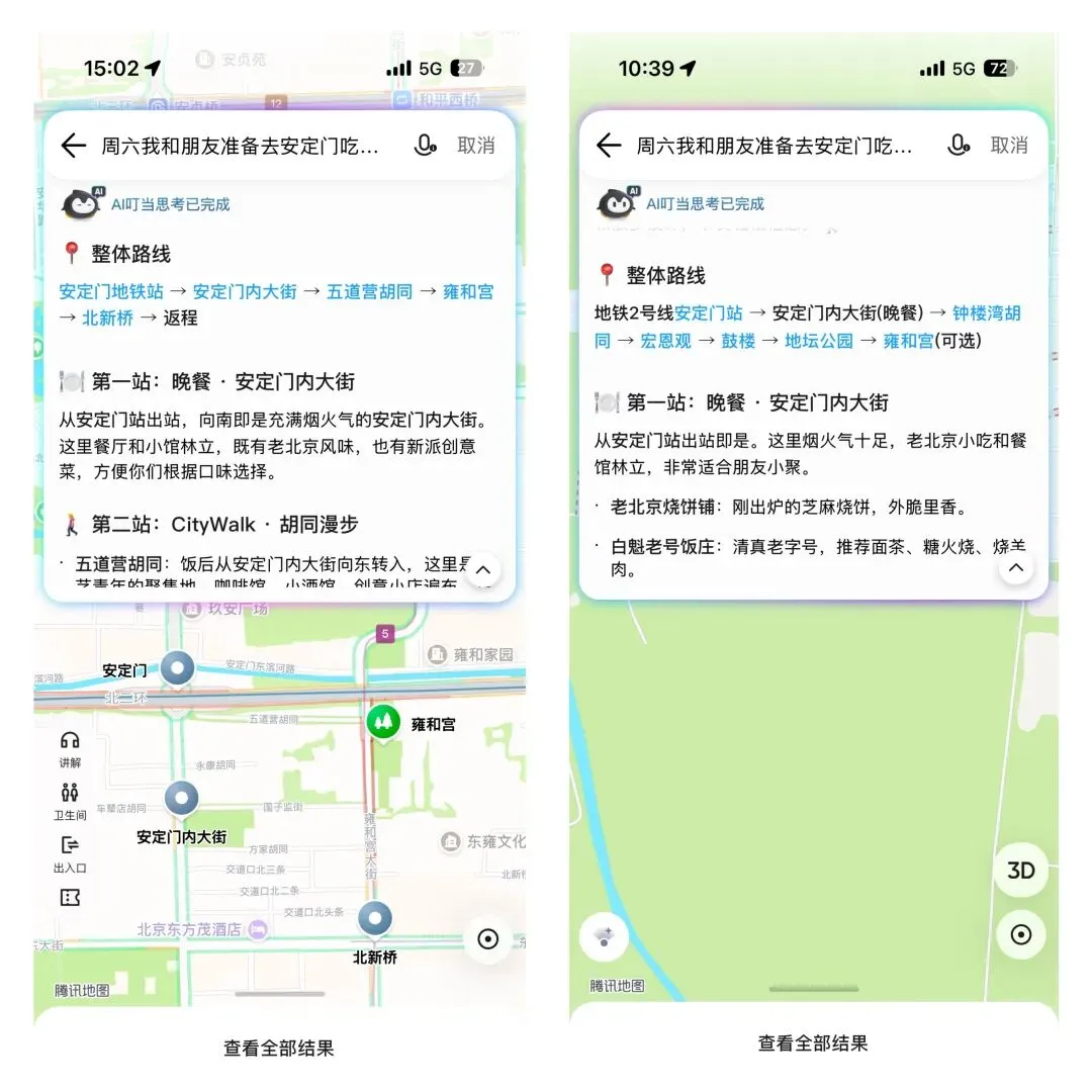 3.路线规划的回答编排策略着实有点粗糙,query里没有明确表达出发地点,也就不必要返程回安定门。现在给出了返回安定门,这是一个跨城旅行的回答逻辑,跨城我确实得回到出发地,但bro,这不是citywalk的回答逻辑。是干活的兄弟们都没时间citywalk了吗,这个场景都没拆一下…第二条路线的绕路情况明显,另外走完了估计要第二天早上…