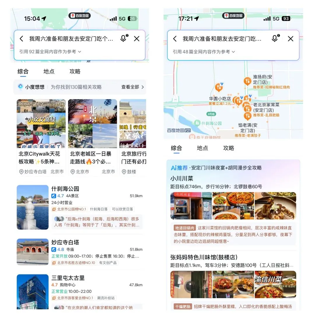 2.针对景点线路意图的回答逻辑,只推了攻略和景点,和query的相关性太低了,回答内容组织形式还是传统的列表,真真儿还不如早期百度地图出的「马克地图」体验好。咱就说「出攻略」这功能,我要是到了地图App还先看攻略的话,我为什么不去🍠看呢?人那不更多么?