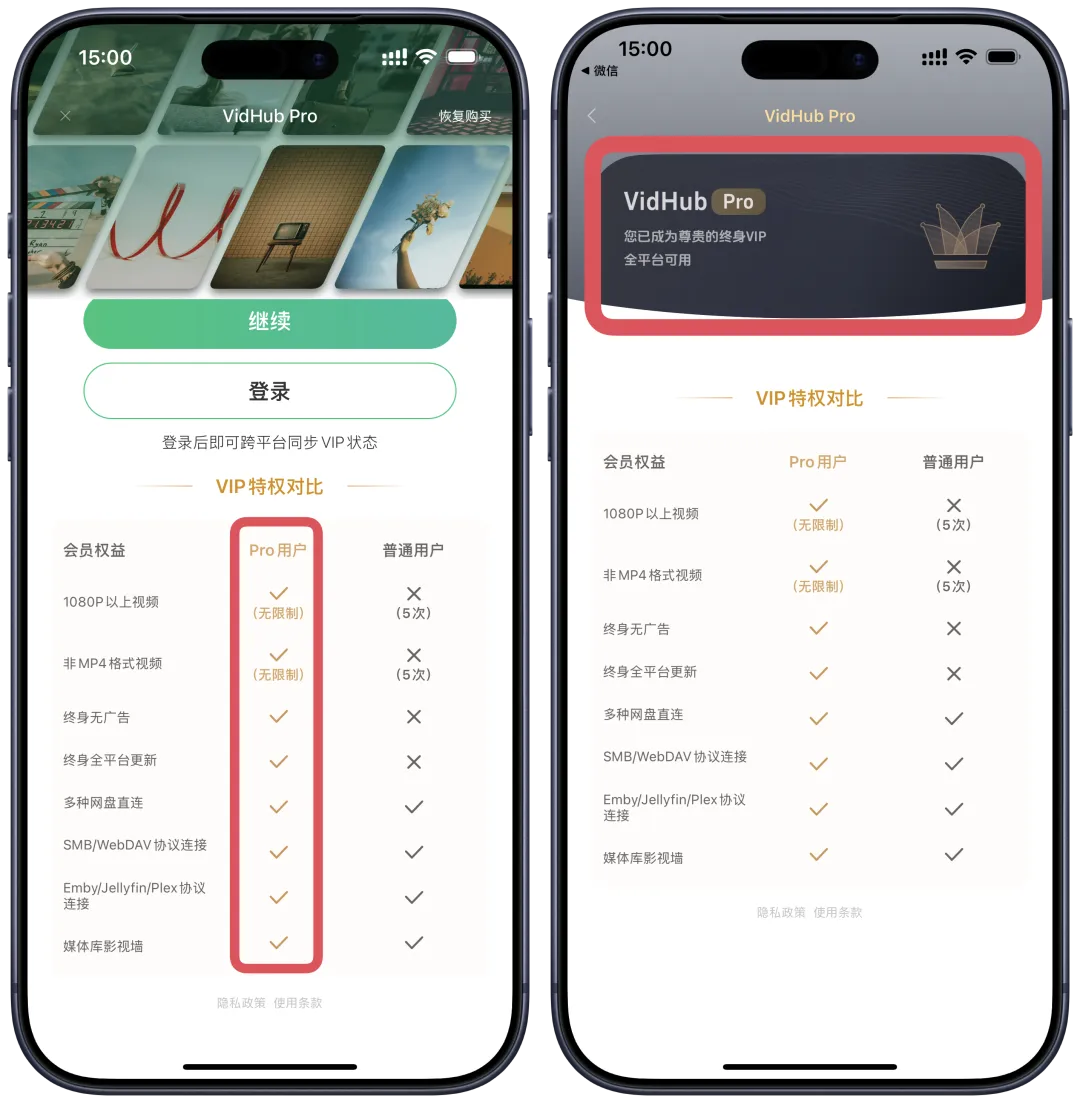 VidHub 免费下载,普通用户支持多种网盘,多种协议的链接,但是在播放高清视频方面有一定的限制。开通会员之后,拥有全部的高级功能,而且支持终身全平台更新。