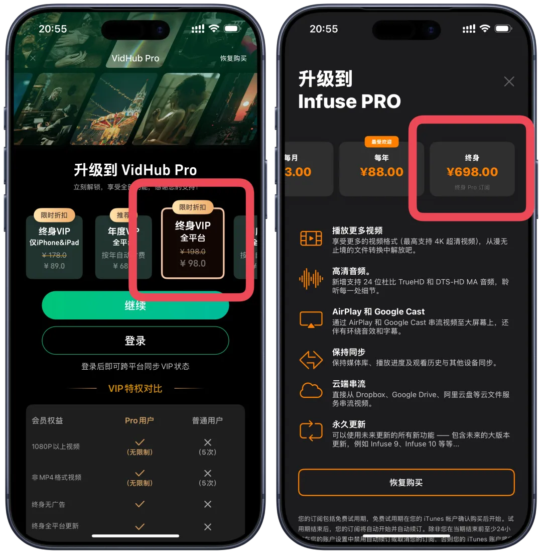 VidHub 年度会员 ¥68,终身全平台VIP ¥98,相比infuse 终身 ¥698 的价格,VidHub 以1/8 的价格拥有 infuse 99%的能力,太香了,我愿称之为“国产视频播放器之光”。