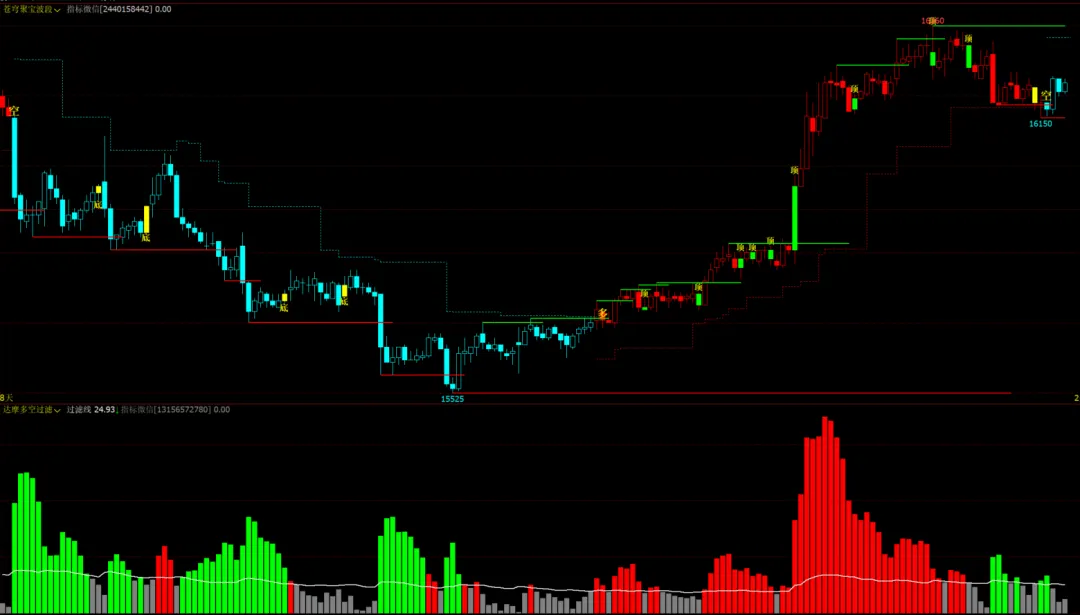 达摩多空过滤幅图:红绿涨跌柱,灰色住震荡阶段