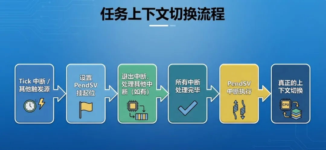 假设这样一个场景:Tick 中断触发,正准备切换任务,突然来了个更高优先级的外设中断。如果在 Tick 里直接切换上下文,这时候栈的状态会乱套——你还没保存完,新中断又压了一堆东西进来。