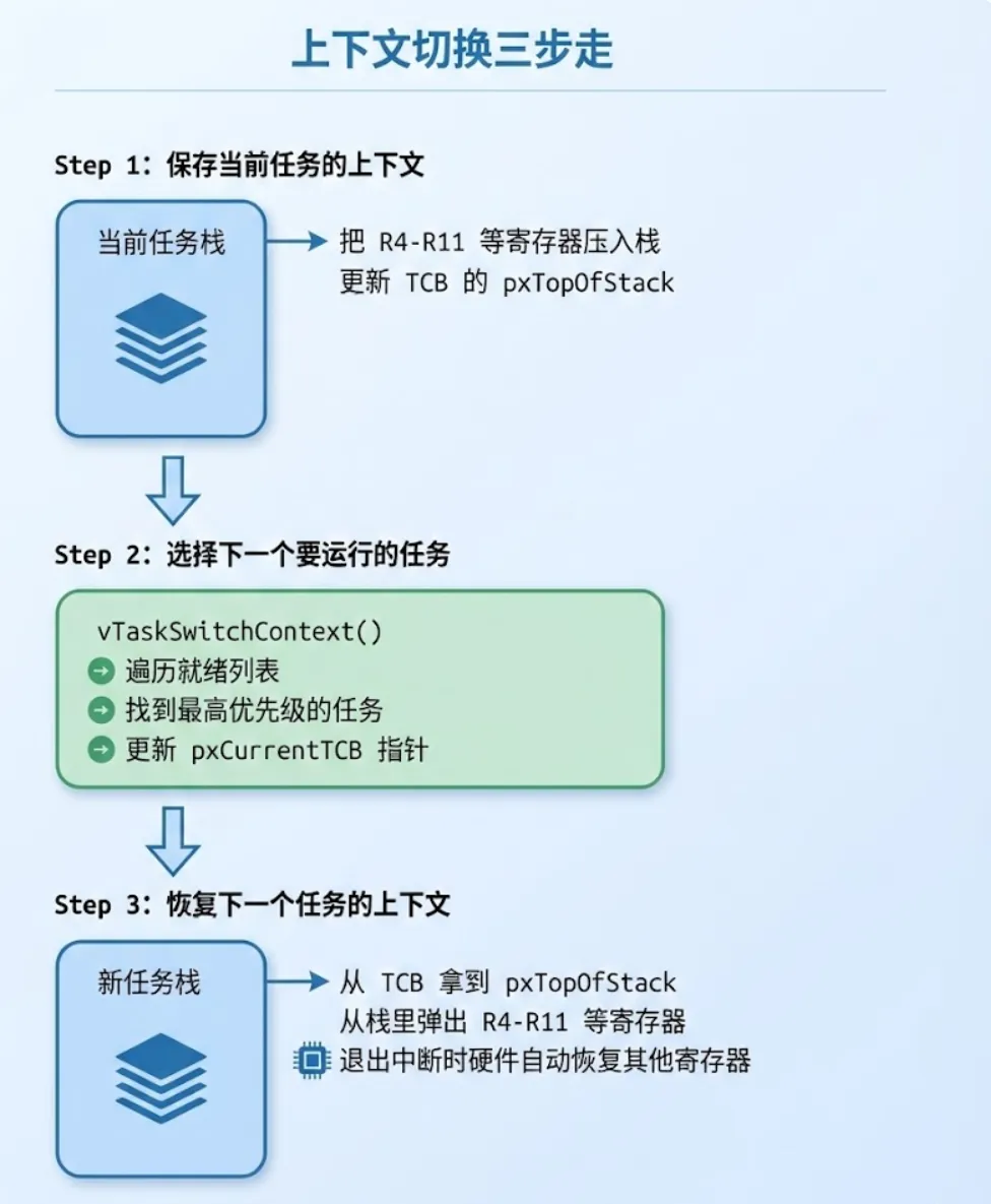 用一句话概括:触发 PendSV 中断,保存当前任务的寄存器到栈,选出下一个任务,从它的栈恢复寄存器,然后继续执行。